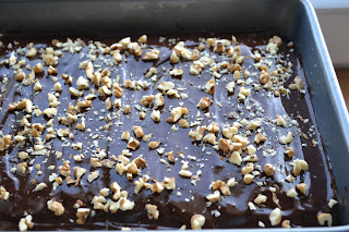 Na to som naliala polevu- v hrnci som nechala zohriať na horúco smotanu a pridala som na kúsky nalámanú čokoládu. Odstavila som z plynu a za stáleho miešania som nechala čokoládu v smotane rozpustiť. Polevu som naliala na koláč a zasypala orechami.